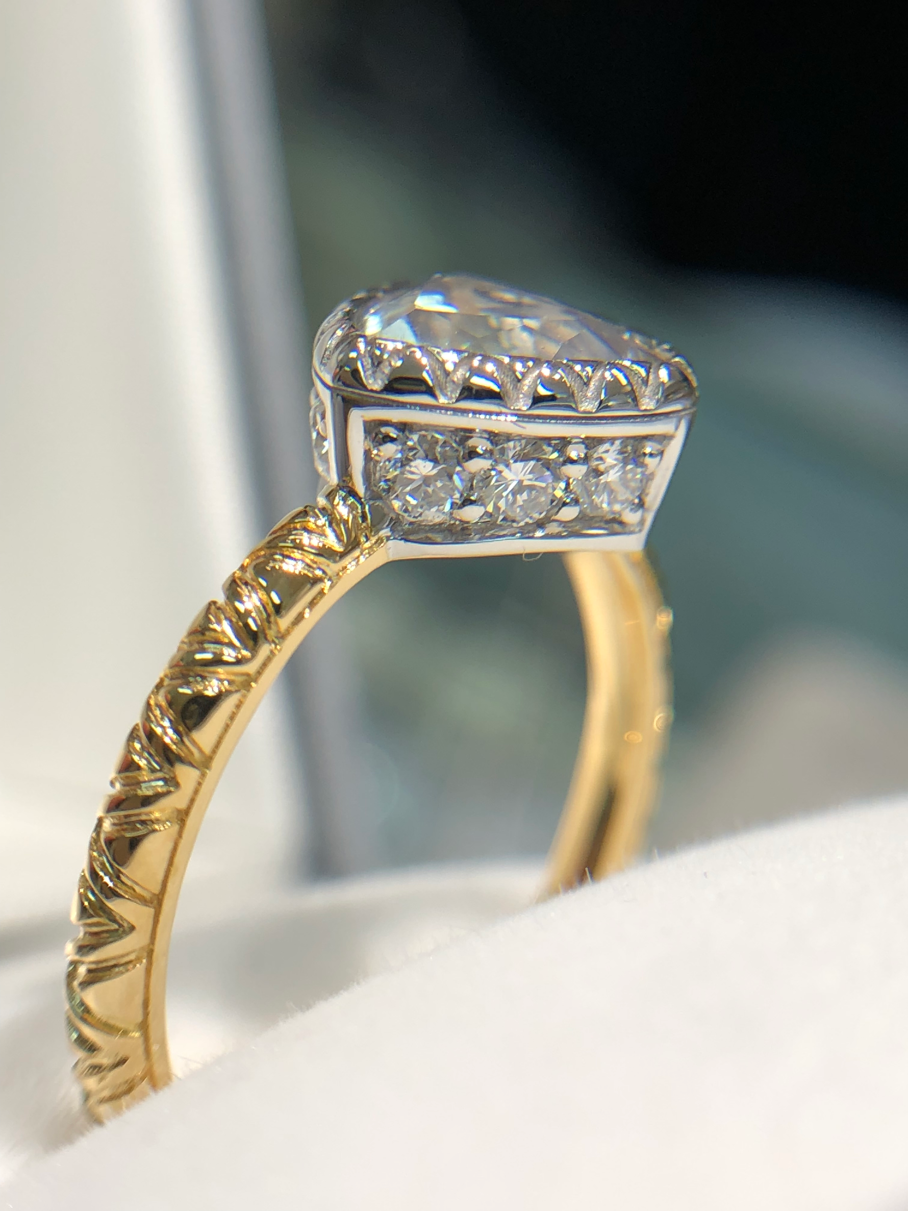 This price is a guide for setting (the center stone in the picture is 1.25 ct) and does not include the center stone. Setting costs vary depending on the size of the center stone, the gold price on the date of shipment, and the public price of diamonds. Please contact us for details.